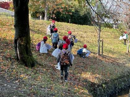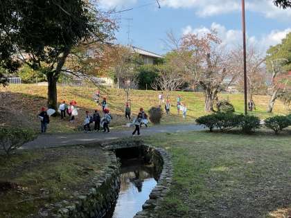 嵐山東公園でフィールドビンゴをやりながら、秋のものみつけをしました。沢山のどんぐりや銀杏の葉を見つけることができました。