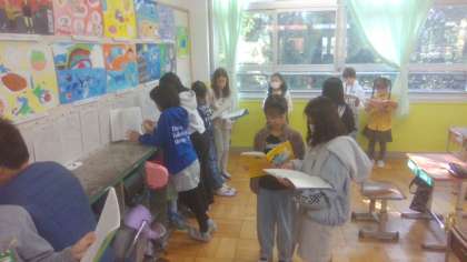 国語科で推理物の題材で学習に取り組んでいます。同じような出来事でも、少し様子がちがう登場人物の言動を読み解き、真相を明らかにしていきます。場面ごとに自分が面白いと思ったところを友達と交流し合いました。