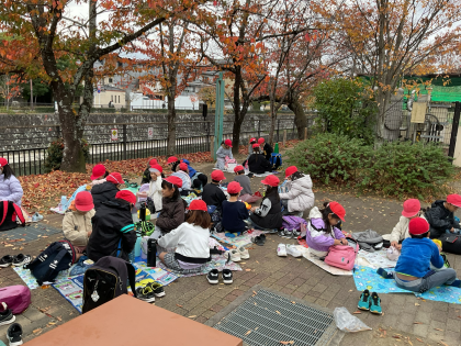 落ち葉の絨毯の上にシートを広げて班ごとに食べました。「おいしい〜!」と、笑顔でモグモグ食べていました。