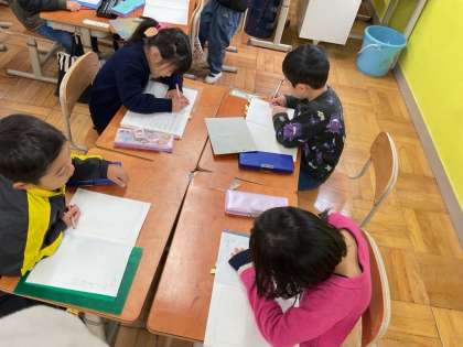 身の回りにある、かたかなで書くものをグループで探して、ノートに書きました。