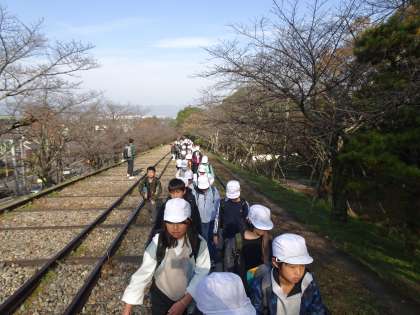 インクラインでは、長いレールの上を歩きました。「このレールの上には電車が走っていたのではないか?」とつぶやきながら歩く子どもたちもいました。