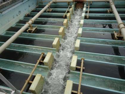 急速ろ過池では、沈殿処理した水を、砂と砂利の層でろ過し、さらにきれいな水にしていきます。きれいになった水を見て、水をきれいにする仕組のすごさに驚いていました。