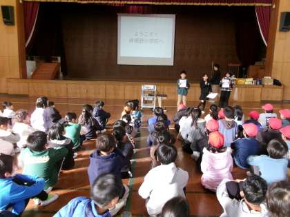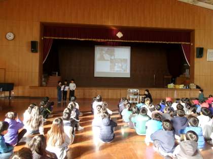 今日は、京都朝鮮第二初級学校との交流会を行いました。体育館に集まり、まずは嵯峨野小学校について紹介しました。学校生活の様子や、給食についても伝えました。また、京都朝鮮第二初級学校の学校紹介を聞きました。子どもたちは、学校へ登校する方法や、学校の時間、教科書、クラブ活動など、いろいろなちがいがあることに驚いていました。