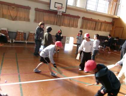 交流会では、日本の伝統遊びとして「羽子板」に取り組みました。羽を落とさないように打ち合おうと打ち方を工夫する姿が見られました。お互いに声を掛け合いながら打ち方に工夫を加えることができました。