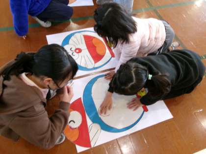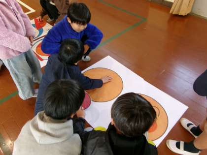 日本の伝統遊びとして「福笑い」に取り組みました。見本通り完成できるよう、声をかけあって楽しむことができました。上手に完成できた時は歓声が上がっていました。
