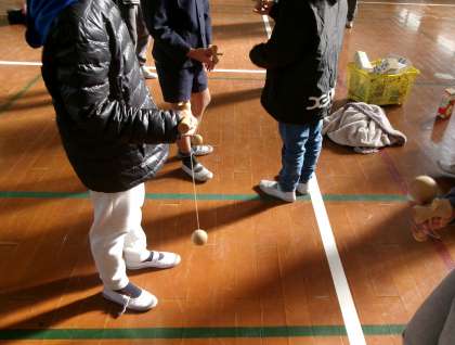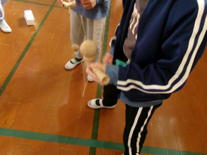 日本の伝統遊びとして「けん玉」に取り組みました。けん玉を得意とする児童が積極的にコツを伝える姿が印象的でした。