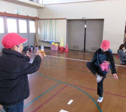 チェギを足で蹴り上げリフティングのように落とさないように繰り返し蹴り続けて遊びます。リフティングを得意とする児童は夢中で取り組んでいました。