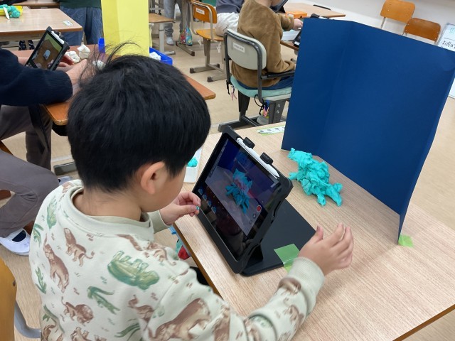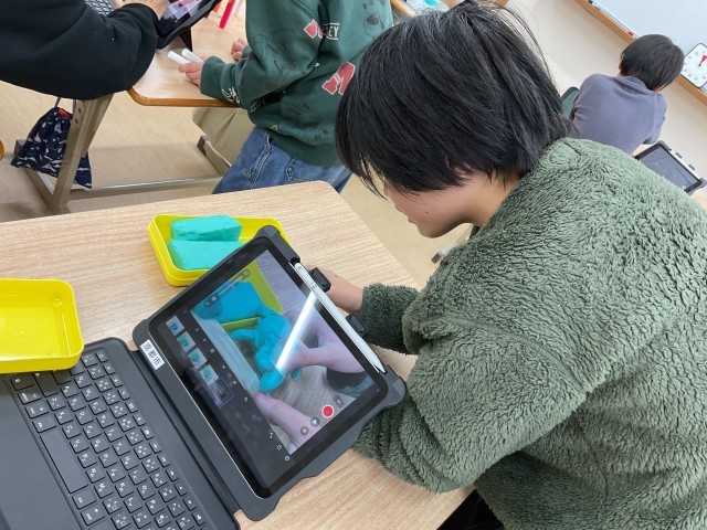 車がスムーズに駐車場に停める様子を、車の角度を調節して、慎重に置いていました。また、粘土で生き物が完成していく様子を表現している友達のところに集まって、「すごい!進化していくなあ。」とその動画に感心している姿もみられました。撮影した写真が100枚を超える大作もあり、見ごたえのある作品が仕上がっています。