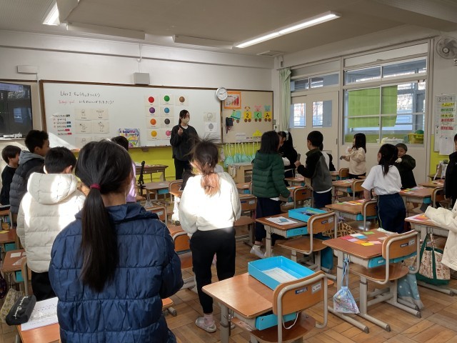色の言い方を学習しています。曲をよく聴いて、自分の好きな色の名前に合わせて、楽しく体を動かしていました。