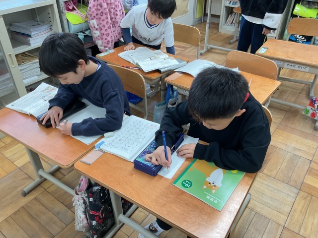 学校にあるものでみんなが知っているものを使って、クイズを作っています。「クラス全員がもっています」「文字が書かれています」「カバーがついています」など、問題の答えの特徴を思いうかべて、2人で協力してヒントをたくさん考えていました。