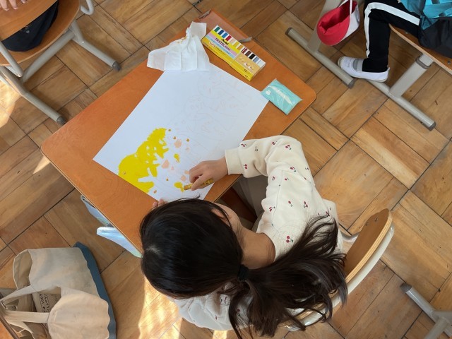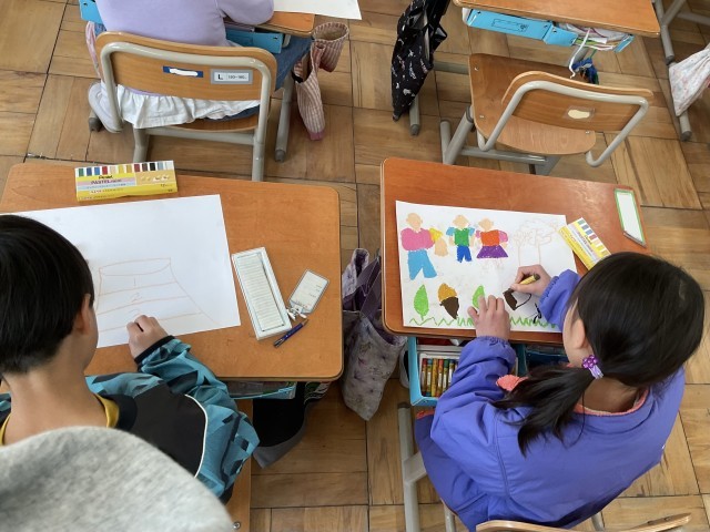 完成した絵は、新年度に1年生の教室の後ろに掲示する予定です。新1年生に、絵をみてわくわくした気持ちになってもらえるよう、心を込めて描いていました。
