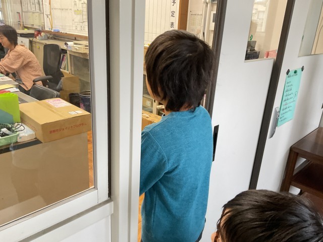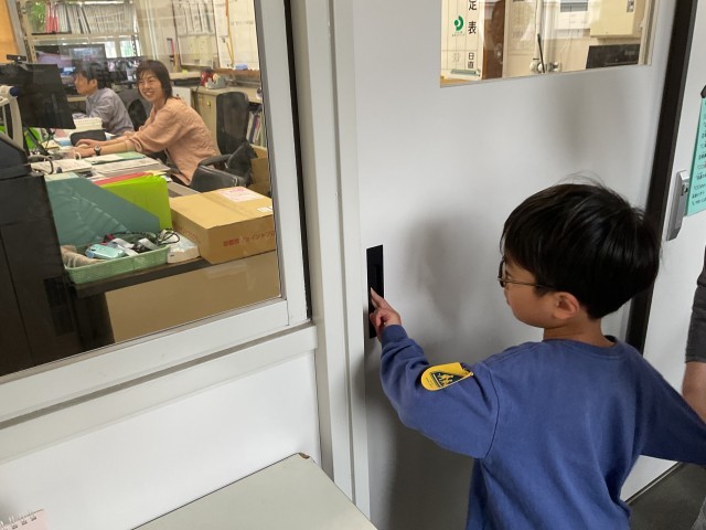 最初に6年生が、職員室へ入り、他の子どもたちは、それをしっかり見てから、一人ずつ入りました。大きな声で「失礼します。」と言う人や、恥ずかしそうに言う人、にこにこして入る人など、それぞれが、挨拶をして入ることができました。