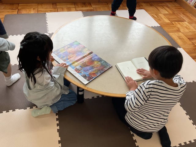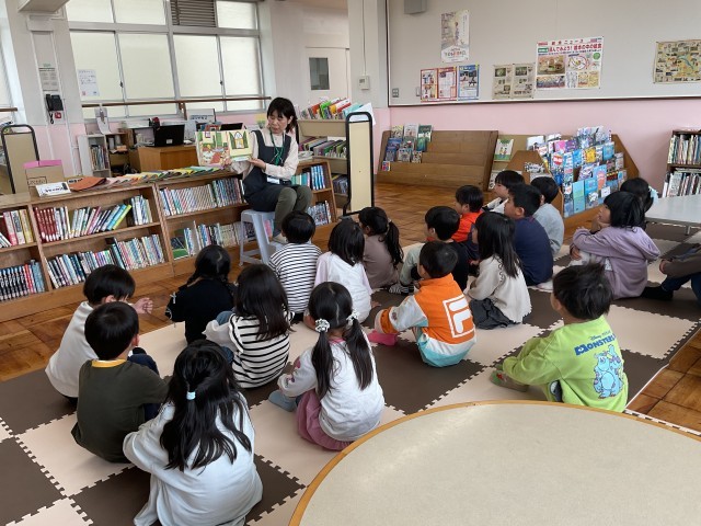 初めての図書室に行きました。司書の先生に読み聞かせをしてもらい、図書室でのルールを教えてもらいました。そして、自分で読みたい本を一冊選んで読みました。