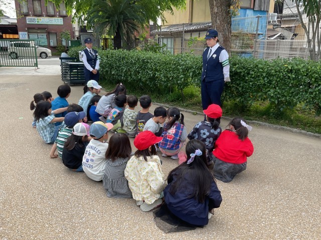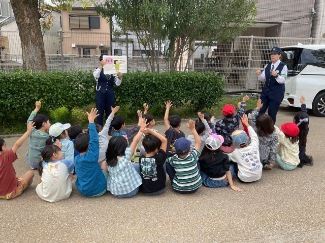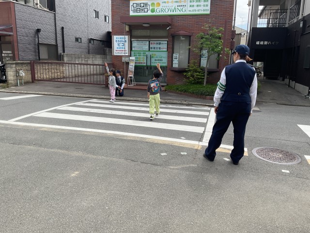 右京警察の方に来ていただき、交通安全教室を行いました。横断歩道の渡る時に注意することを確認し、正門の前の横断歩道で実際に安全に渡る練習をしました。