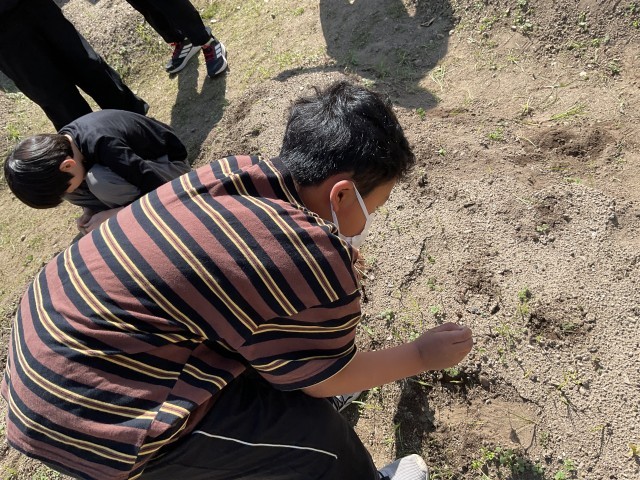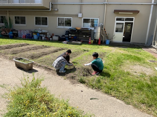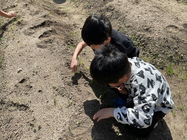 朝の会の後、嵯峨野ファームに行きました。春の畑に、新芽がたくさん出ています。「虫がいる。」「こっちも抜いておこう。」「こんなに取れた。」と友達と話しながら、ぽかぽか陽気の中活動しています。今年は、何を植えるのか、みんなで話し合って決める予定です。
