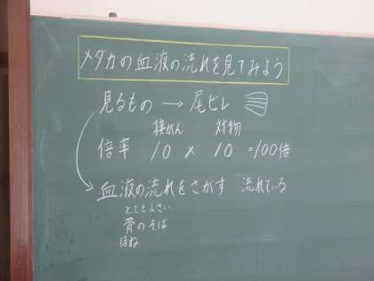 顕微鏡で,メダカの血液の流れを見ました。