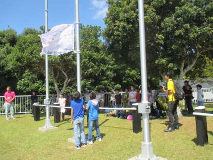 校歌のCDが、途中で、調子悪くなりましたが、それでも、しっかり歌い切りました。とてもよかったです。みんなの作った旗も上げました。所員さんのお話や注意を聞きました。木陰で聞かせていただけたので、助かりました。風はさわやかですが、日差しは厳しく、日なたは暑かったです。
