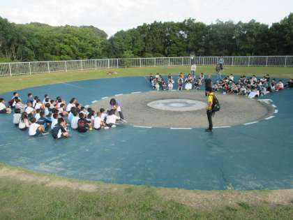 4年みさきの家2日目、朝の集いは、第1営火場で、明親小学校と合同で行いました。