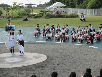 お互いに校歌を歌って旗を揚げ、学校紹介もしました。