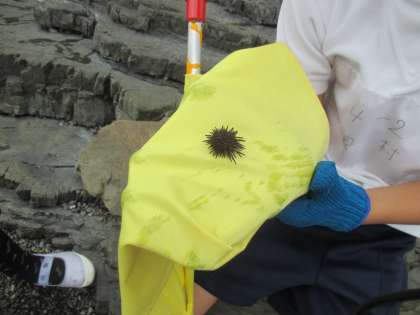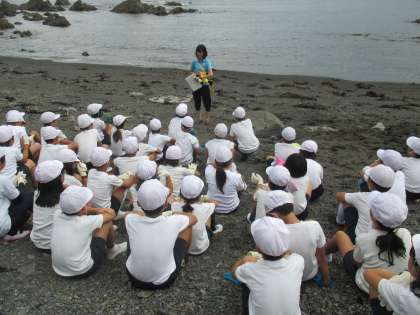 昼食の後、宮崎浜に行って、磯観察をしました。明日行く「鳥羽水族館」の所員さんに生き物の名前を教えてもらいながら、観察しました。