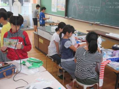 地域ボランティアの方々にも,ミシンの使い方を手伝ってもらいました。