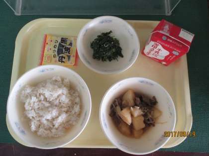 今日の給食のメニューは,肉じゃがとほうれん草とじゃこのいためものです。