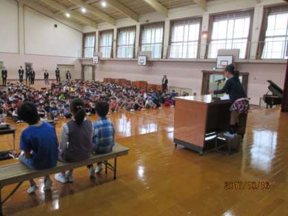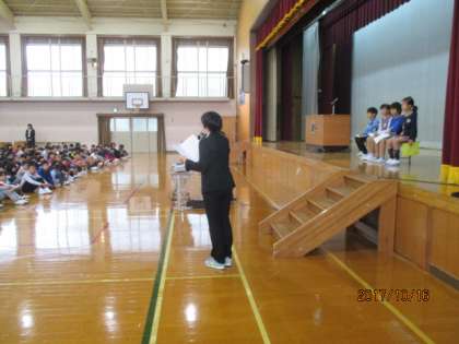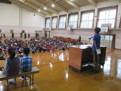 全校児童の前で堂々と発表していました。