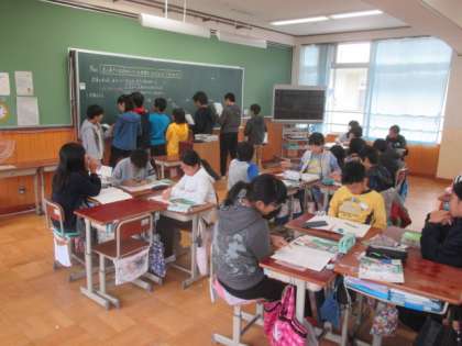 丸いレキや化石の入っている地層がどのようにして出来たのかを考えました。