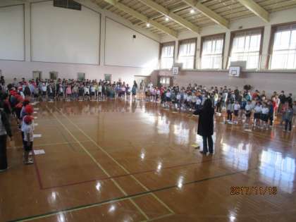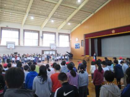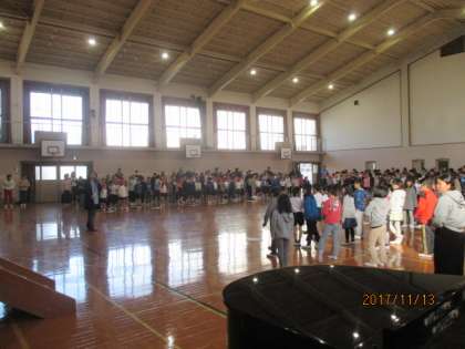 学習発表会で発表する「コスモス」を全校児童で練習しました。