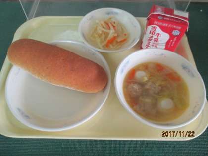 今日の給食献立は,肉だんごのスープ煮とじゃがいものピリカラいためです。