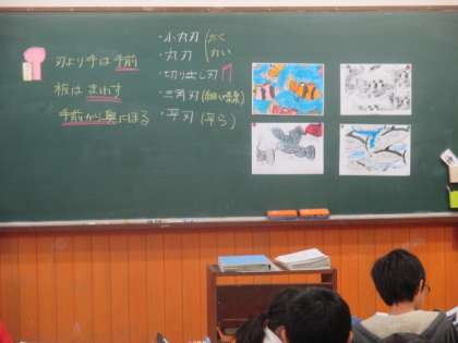 いろいろな彫刻刀の特長を生かして,彫る練習をしました。