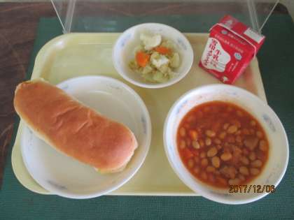 今日の給食献立は,ポークビーンズとカリフラワーのホットマリネです。
