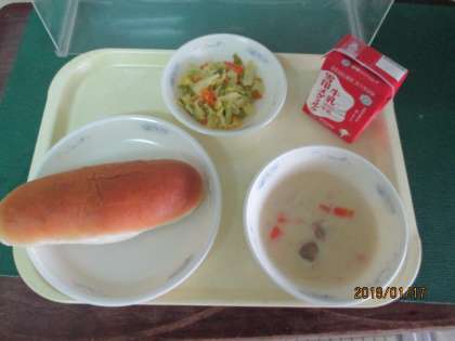 牛乳・あじつけコッペパン・とうにゅうのクリームシチュー・野菜のソテー
