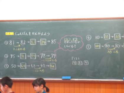 順番に並んだ数字の中に,空白の箱があります。その中に,どんな数字が入るのか考えました。