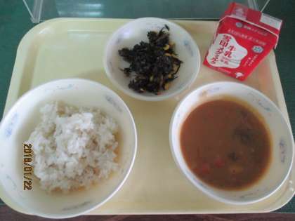 今日の給食献立は,カレーとひじきのソテーです。