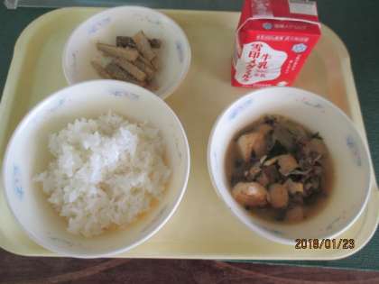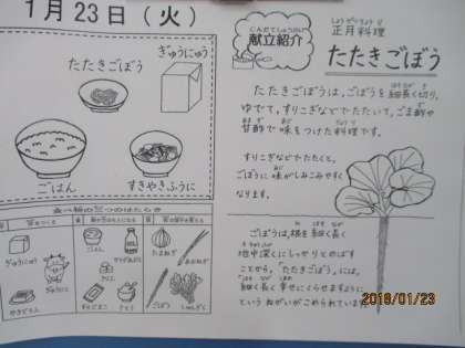 今日の給食献立は,ごはん・たたきごぼう・すき焼き風煮・牛乳です。
