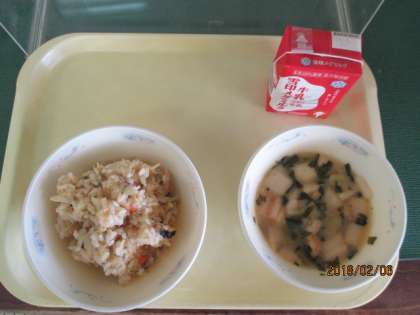 今日の給食献立は,炊込み五目ご飯とみそ汁です。