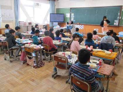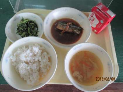 今日の給食献立は,牛乳・むぎごはん・さんまのしょうがに・だいこんばのごま炒め・キャベツの吉野汁です。