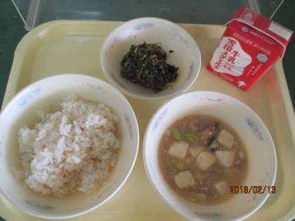 今日の給食献立は,麦ごはん,牛乳,豚肉ととうふのくず煮,ほうれん草ともやしのごま煮です。