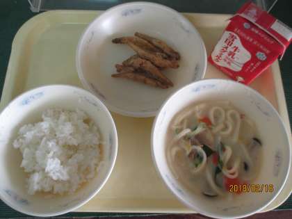 今日の給食献立は,減量ごはん,牛乳,わかさぎのこはくあげ,豆乳鍋(うどん入り)です。