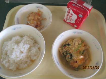 今日の給食献立は,ごはん・牛乳・親子煮・てっぱいです。