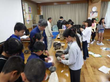 後半は,京都市埋蔵文化財研究所の方が持ってきてくださった本物の土器や石器を触らせてもらいました。