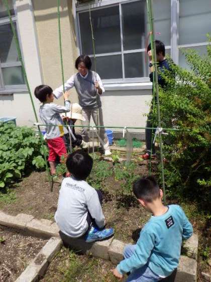 5月14日(月)さくらんぼ学級の生活では,キュウリの支柱づくりをしました。