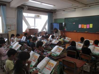 音楽の学習では,「つばさをください」「子犬のビンゴ」の曲を通して,拍子を感じながら歌ったりリズムを打ったりしていきました。