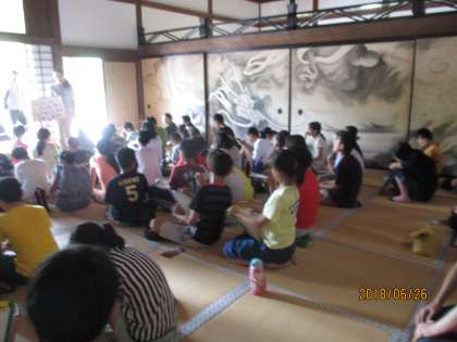 お寺の好意で,本来は入れない方丈に入れて頂き,普段は非公開のふすまの龍も見せてもらいました。龍安寺の歴史や石庭についても説明して頂き,子どもたちからのたくさんの質問にも丁寧に答えて頂きました。