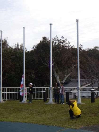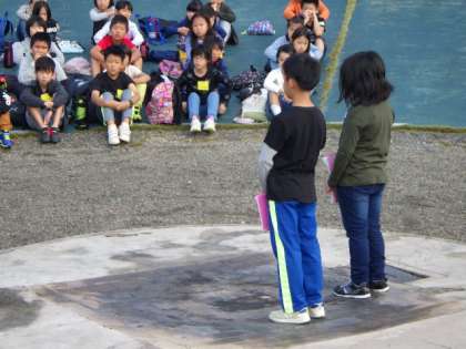 松尾小学校さんは、ちょうど、御室小学校の倍ぐらいの児童がいます。お互いの学校紹介をしたり、校歌をうたって旗を揚げたりしました。