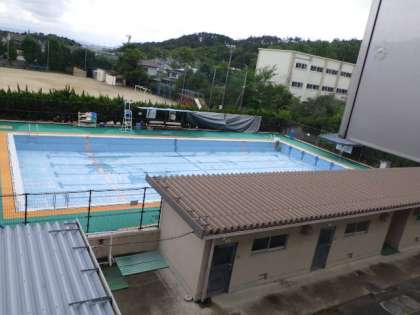 6月10日(月)プール清掃を終えたプールは,水が抜かれて,空干し中です。