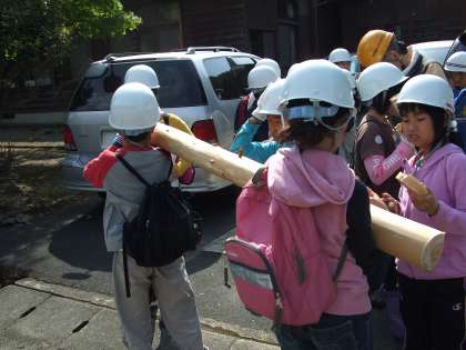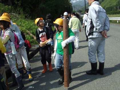 丸太や切れ端を持って山国の家にもどってきました。子どもたちにとって大自然とふれあい貴重な体験となった間伐伐採,どの子も感動していました。。