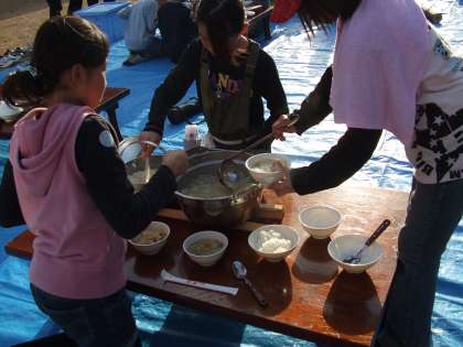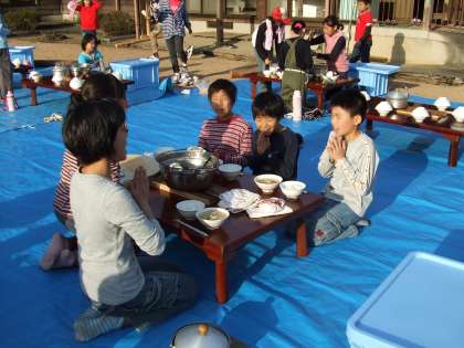 とてもおいしそうなご飯(おこげあり)と豚汁ができあがりました。いただきます。