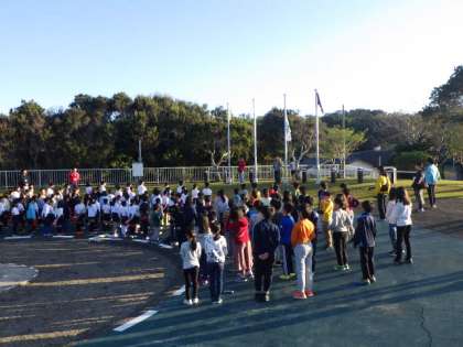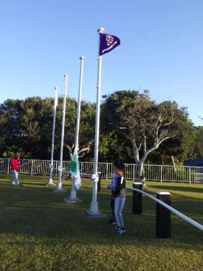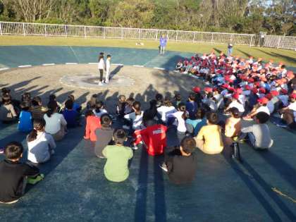 2日目は、同じ日程でみさきの家に来ている山階南小学校と合同の朝の集いをしました。山階南小学校は、山科にある学校です。それぞれの学校の校歌を歌いながら旗を揚げたり、学校紹介をしたりしました。